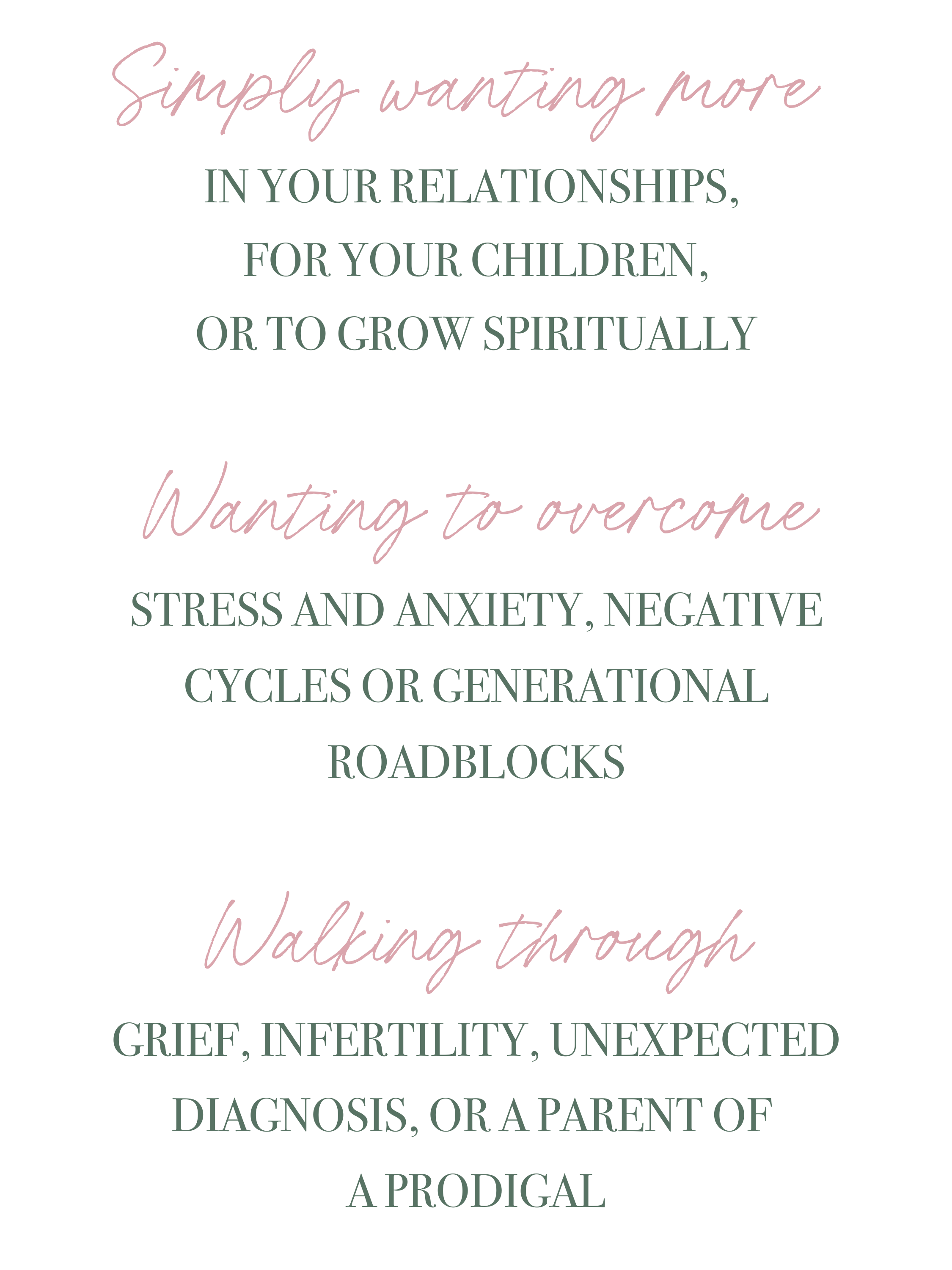 Having walked through seasons of grief, infertility, a loved one’s unexpected diagnosis, relational struggles, and many other trials, I believe God is calling me to assist others on a similar journey. I long to see people get free of the trap of stress and anxiety as well as make their family time more meaningful and intentional.